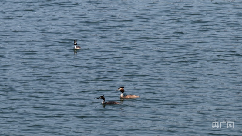 在大名南湖水域游弋的鳳頭鸊鷉(央廣網發 習守政 攝)